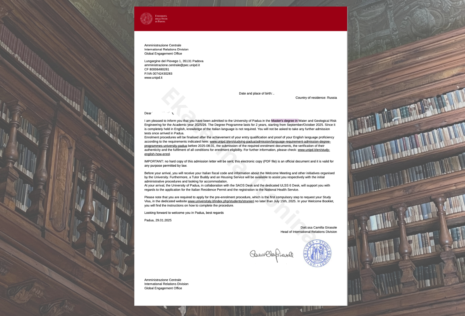 В результате первое же решение оказалось положительным: клиентка получила приглашение в University of Padua на выбранную инженерную программу на английском языке.